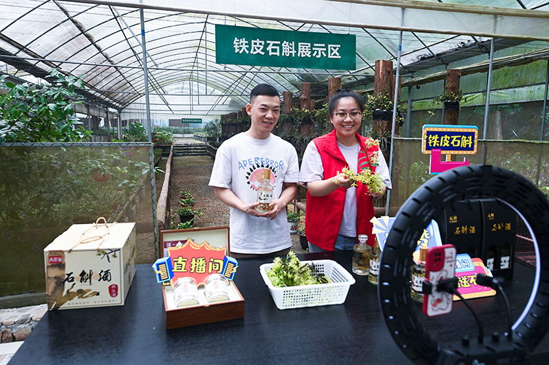在浙江诸暨东白湖镇的铁皮石斛有机种植基地,东白湖镇党员志愿者(右)和基地负责人一起直播销售铁皮石斛花茶、铁皮石斛酒等产品(2023年6月8日摄)。近年来,东白湖镇着力发展铁皮石斛等特色农业产业,加快农业数字化转型,推进农特产品交易服务中心、惠农综合平台以及直播经济的发展。新华社记者 徐昱 摄