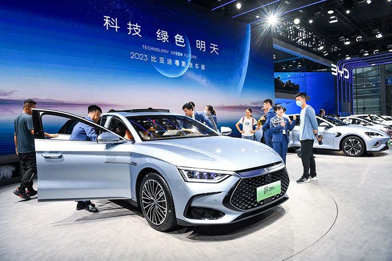 观众在2023粤港澳大湾区车展比亚迪展台了解新能源汽车(2023年6月16日摄)。新华社记者 梁旭 摄